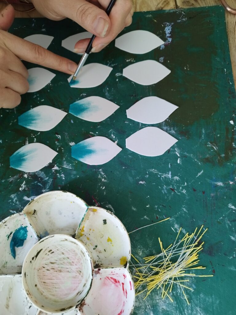 Je colle le pistil sur un support en papier, préalablement peint de la même couleur que la base des pétales, puis j’assemble les pétales un à un