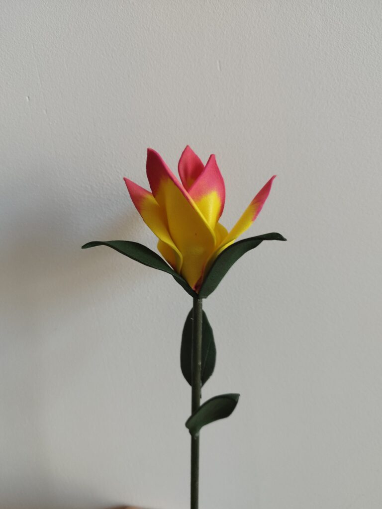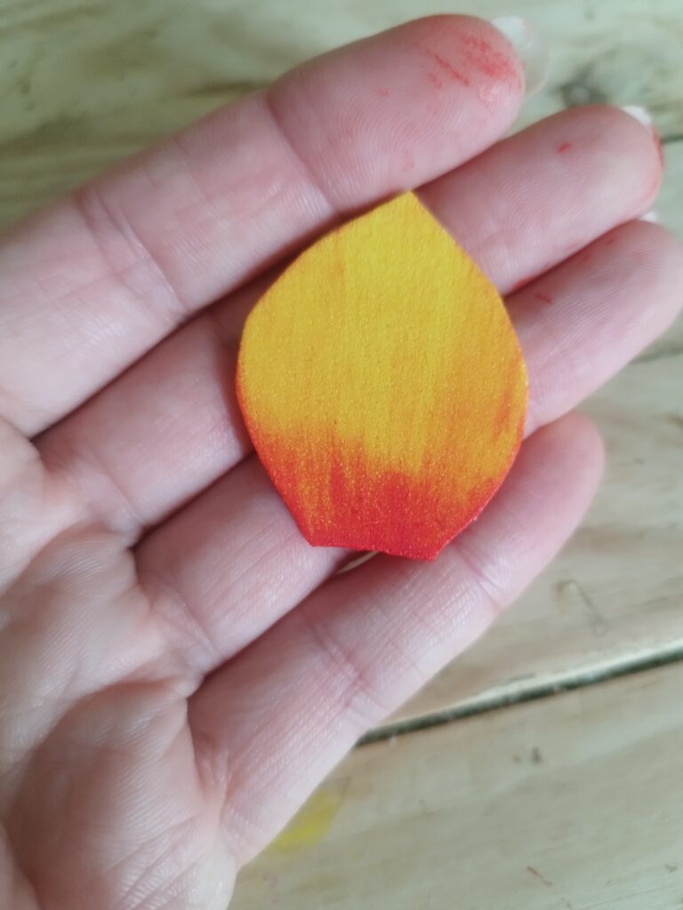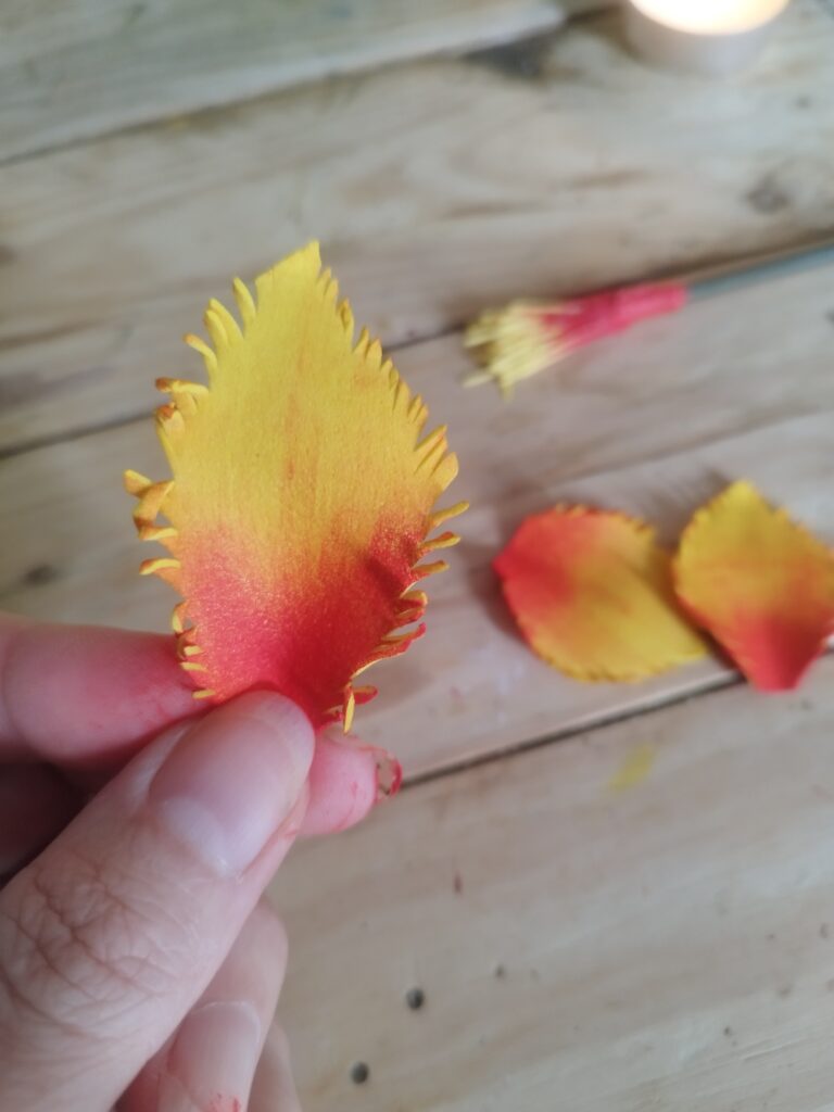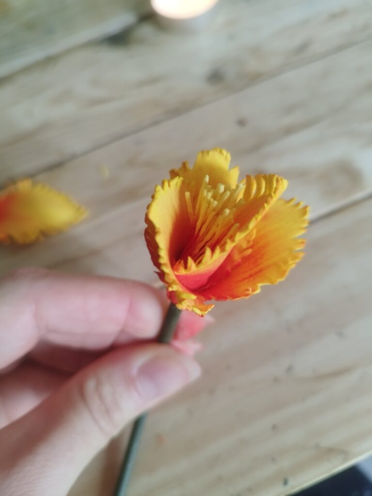 J’ai commencé par peindre les pétales avec une couleur assez flashy pour apporter du peps ! Ensuite, j’ai découpé deux tailles : trois petits et trois grands pétales. J’ai ciselé le contour de chaque pétale, puis je les ai chauffés à la bougie pour que les pointes s’enroulent légèrement. J’ai également incurvé la base des petits pétales pour leur donner plus de volume.