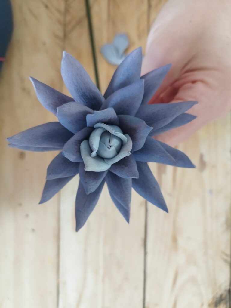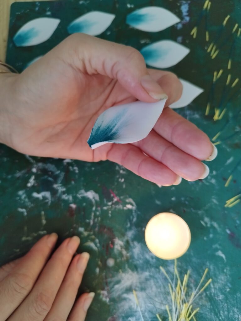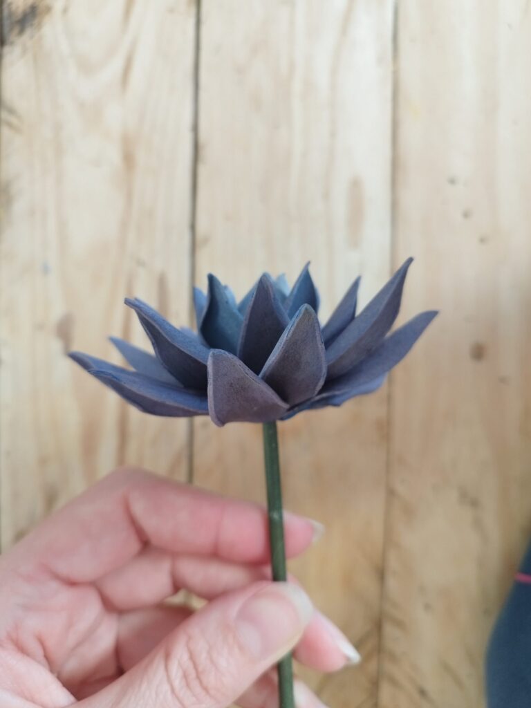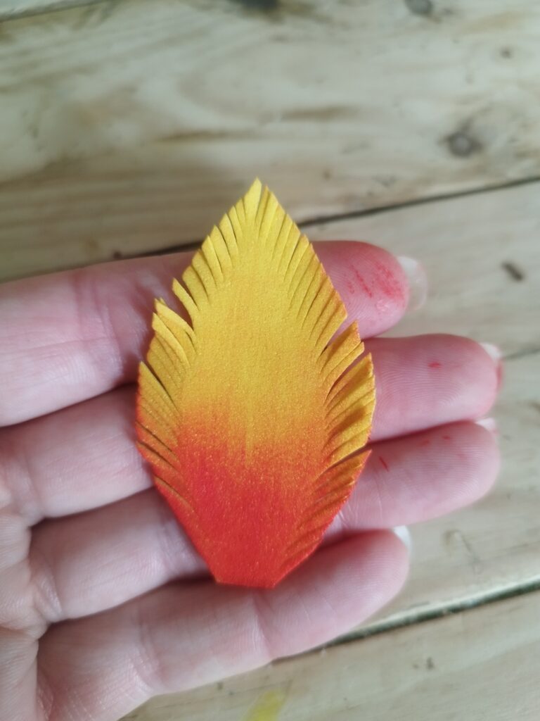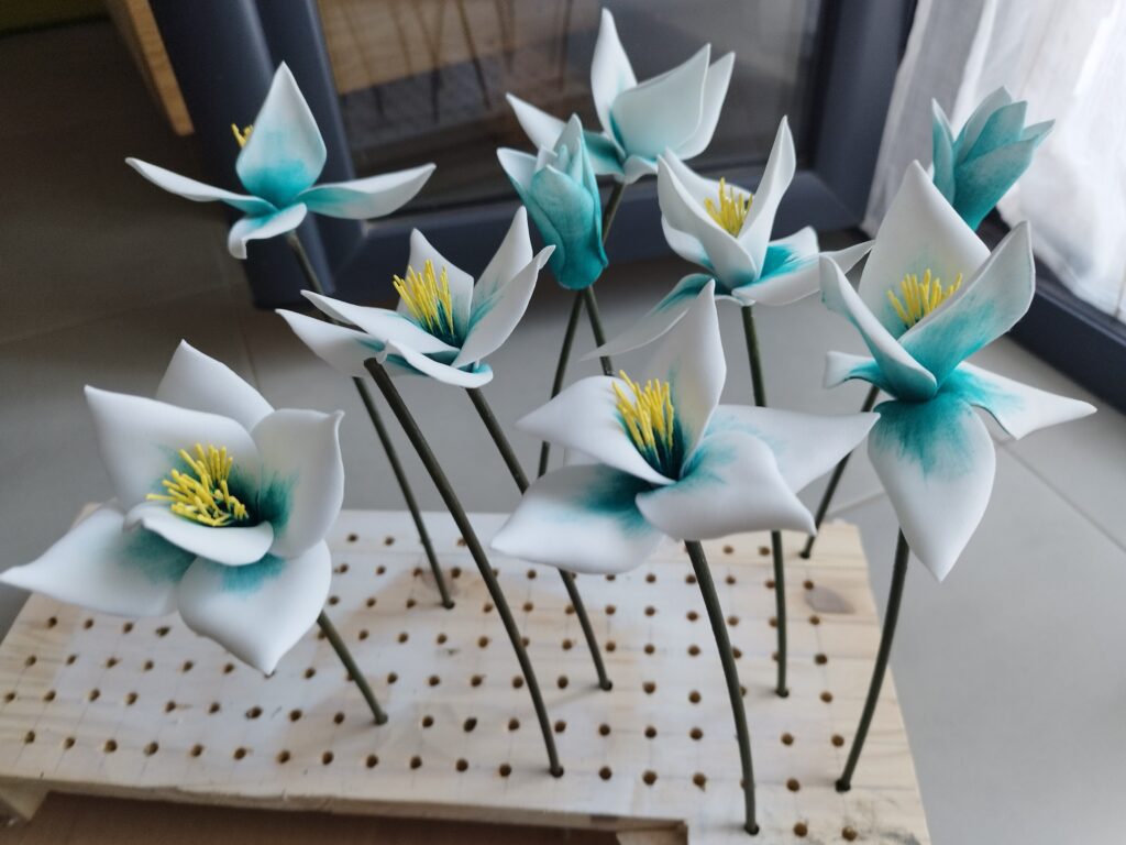 J’ai commencé par peindre les pétales avec une couleur assez flashy pour apporter du peps ! Ensuite, j’ai découpé deux tailles : trois petits et trois grands pétales. J’ai ciselé le contour de chaque pétale, puis je les ai chauffés à la bougie pour que les pointes s’enroulent légèrement. J’ai également incurvé la base des petits pétales pour leur donner plus de volume.