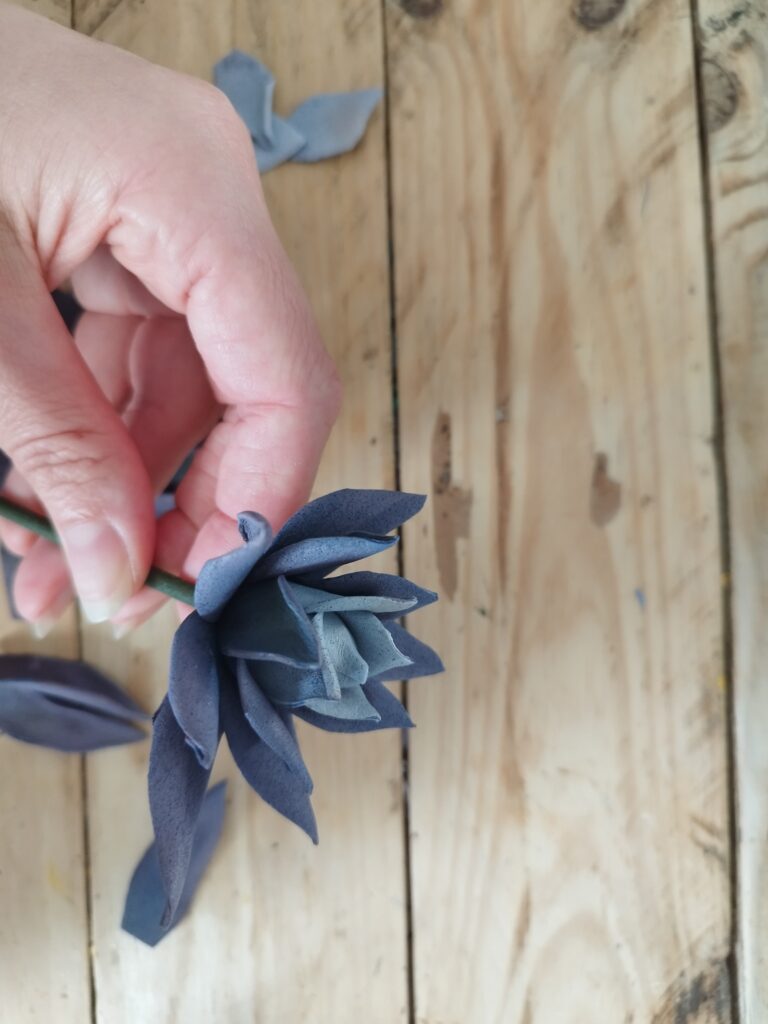 Je colle les pistils, que j’ai préalablement peints de la même couleur que les pétales, puis j’assemble les pétales un à un
